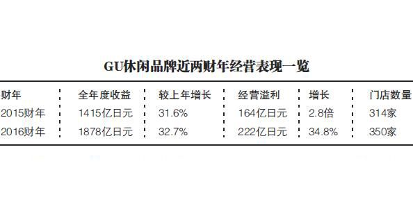在优衣库业绩不佳的2016财年,GU的业绩表现却相当抢眼。据迅销集团2016财年年报显示,GU业绩在2016年度获得压倒性强劲表现,收益与溢利均大幅增加,全年度收益较上年度增加32.7%至1878亿日元,经营溢利增长34.8%至222亿日元。在女装针织衫、裤裙及宽脚裤等潮流商品强劲销售带动下,GU同店销售获得双位数增长。