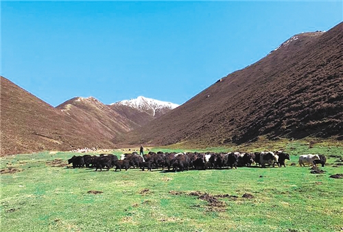生态畜牧业已经成为上滩村脱贫致富的主导产业。图为牦牛养殖大户李存库正在山上赶牛。