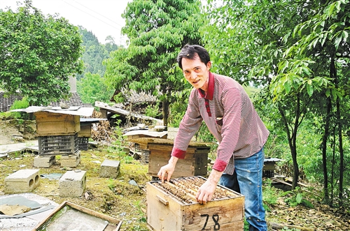 党湾村刘家寨村民刘宗坤在养蜂基地查看蜂箱情况。