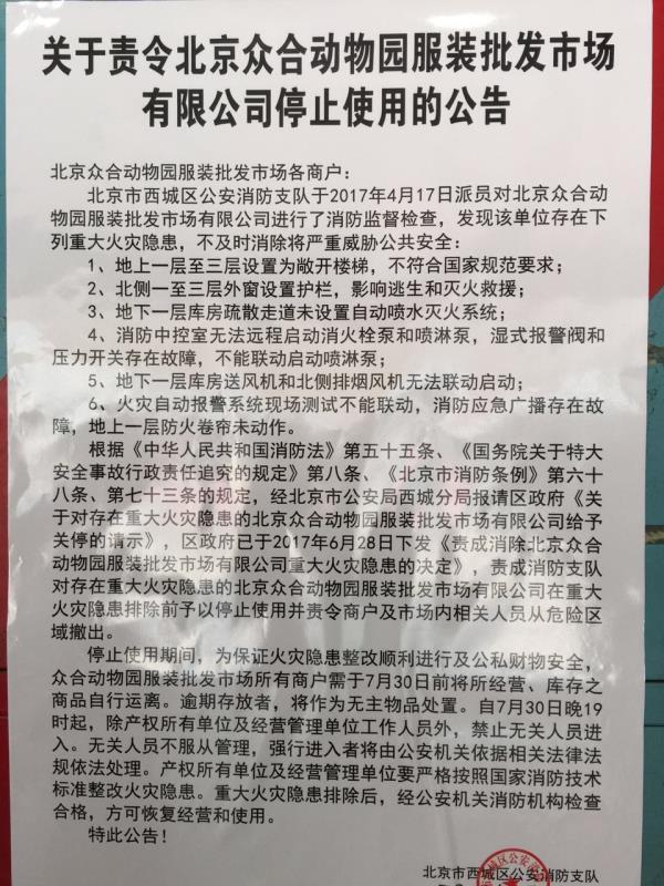 贴在“众合”市场门前的《关于责令北京众合动物园服装批发市场有限公司停止使用的公告》,是由西城区公安消防支队张贴的。内容指出:消防部门曾派执法人员对市场进行了消防监督检查,发现该市场存在6项重大火灾隐患,不及时消除将严重威胁公共安全。区政府已于6月28日下发决定,责成消防支队对存在重大火灾隐患的“众合”市场在重大火灾隐患排除前予以停止使用,并责令商户及市场内相关人员从危险区域撤出。