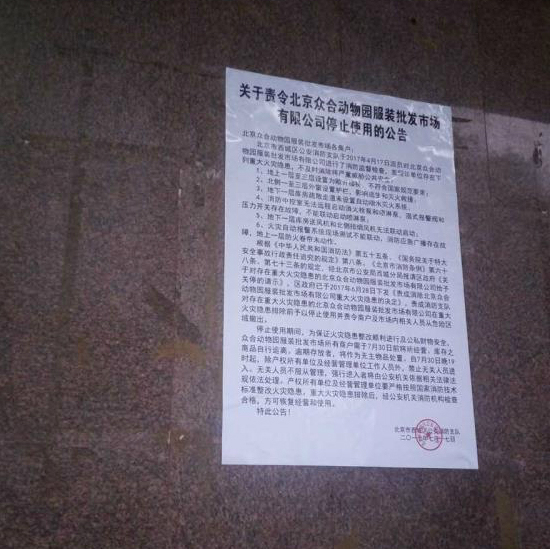 17日下午,北京众合动物园服装批发市场的墙上贴出一纸由西城区公安消防支队张贴的公告:因存在重大火灾隐患,“众合”市场将于本月30日19时起停止使用。今天上午,北京众合动物园服装批发市场有限公司又贴出公告:正在积极与产权方进行沟通,并基本达到一致意见,将于近期公布疏解方案。