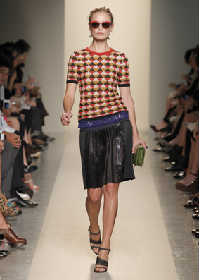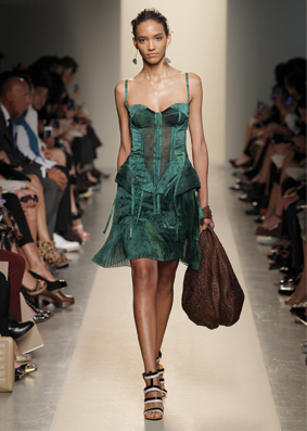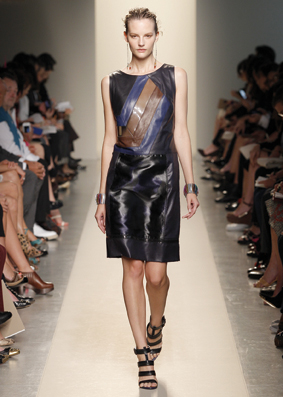 2012春夏季,宝缇嘉(Bottega Veneta)以别致材质与精细工艺为基调,透过特别素材、另类细节及夺目印花,设计出一系列令人惊喜及炫目的服饰。鲜明丰盈的色调以宝石蓝、牛仔布深蓝及靛蓝为主,搭配鲜红、翠绿、橙色、乳白与深啡色,极尽跳脱奔放。衣服轮廓修身贴体,结合敏锐与流线的剪裁,设计一丝不苟,严谨中却又不失美感。造型方面带点朦胧虚幻,连身裙及半截裙均结合富有层次的剪裁,令线条变化多端。