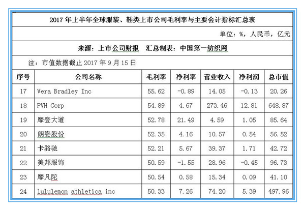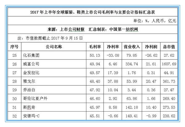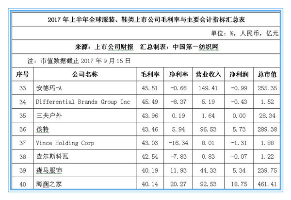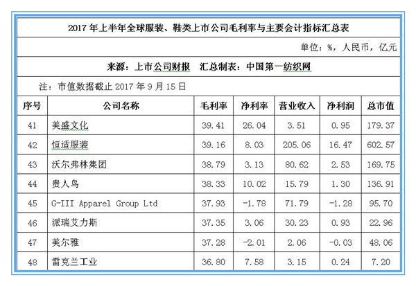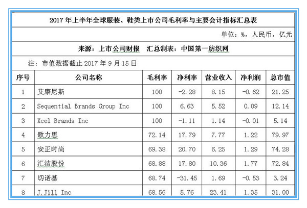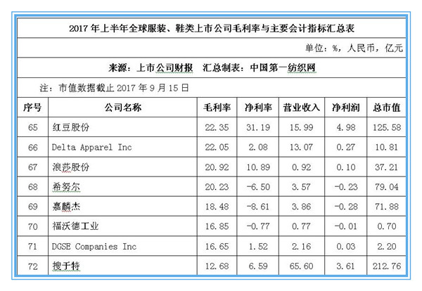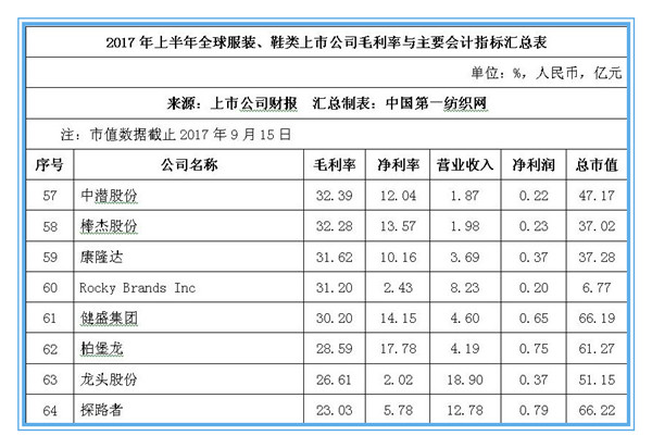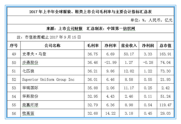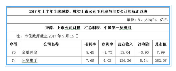 截止2017年9月15日,沪深、港股及美股市场74家服装鞋类上市公司公布今年上半年财报,统计,这74家公司合计实现营业收入2716.08亿元,归属于母公司的净利润130.93亿元,合计市值达9533.01亿元。