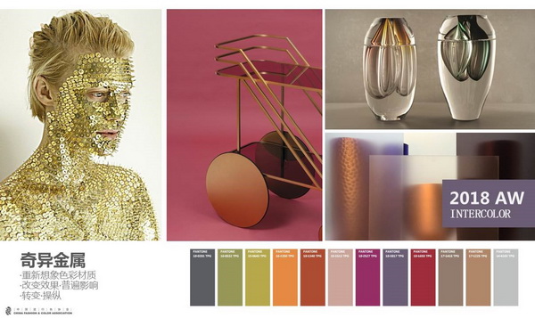 这是一组有金属光泽的色彩,在各主题的奇思异想、色彩的左冲右突下,金属色一定不会躲起来的。当然要有好的金属色效果,材质的新鲜感是首要的。科技的发展使得金属成为我们的第二层肌肤,各种有色金属,与我们的肤质形成对比,显示出性感状态。