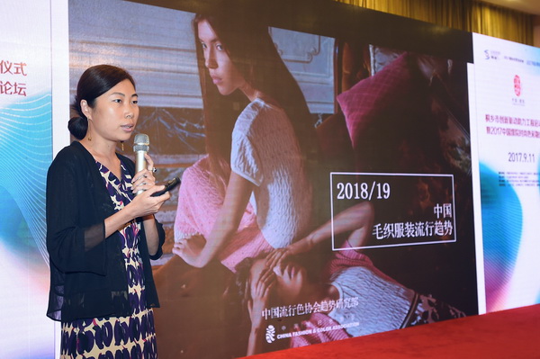 论坛上,中国流行色协会副秘书长,色彩总监,国际流行色委员会中国首席代表兼亚洲色彩评估师招霞发布、解读了2018/19毛衫色彩流行趋势。2018/19秋冬色彩流行趋势分为无限流动、保留的、致敬、分解-反构成、增强、奇异金属六个主题。