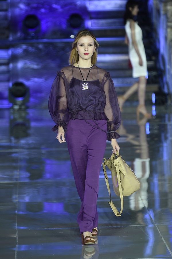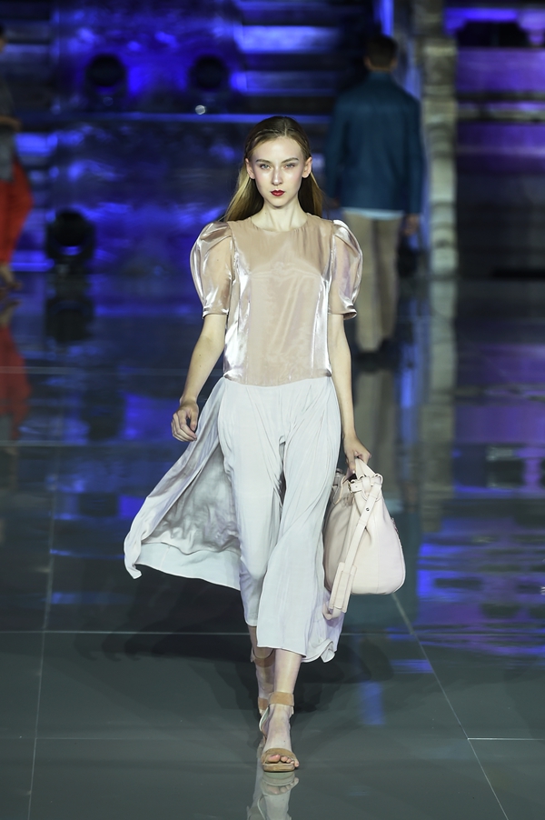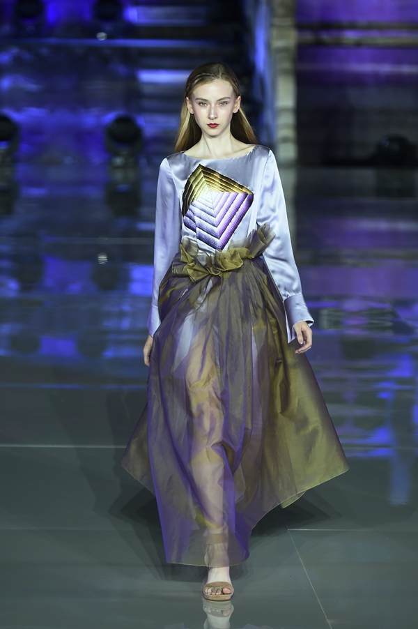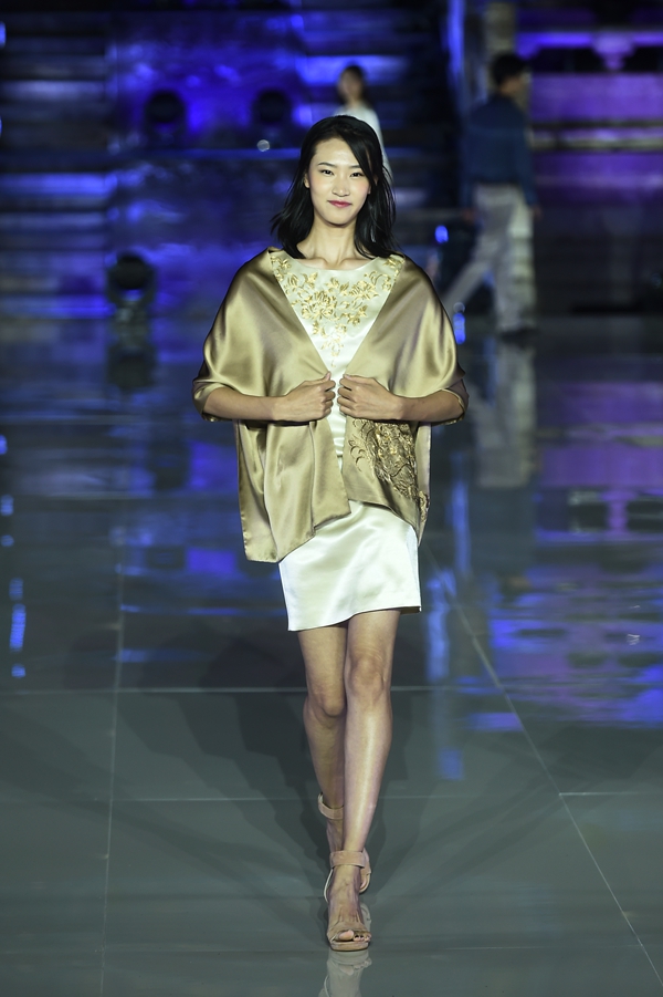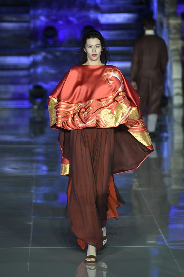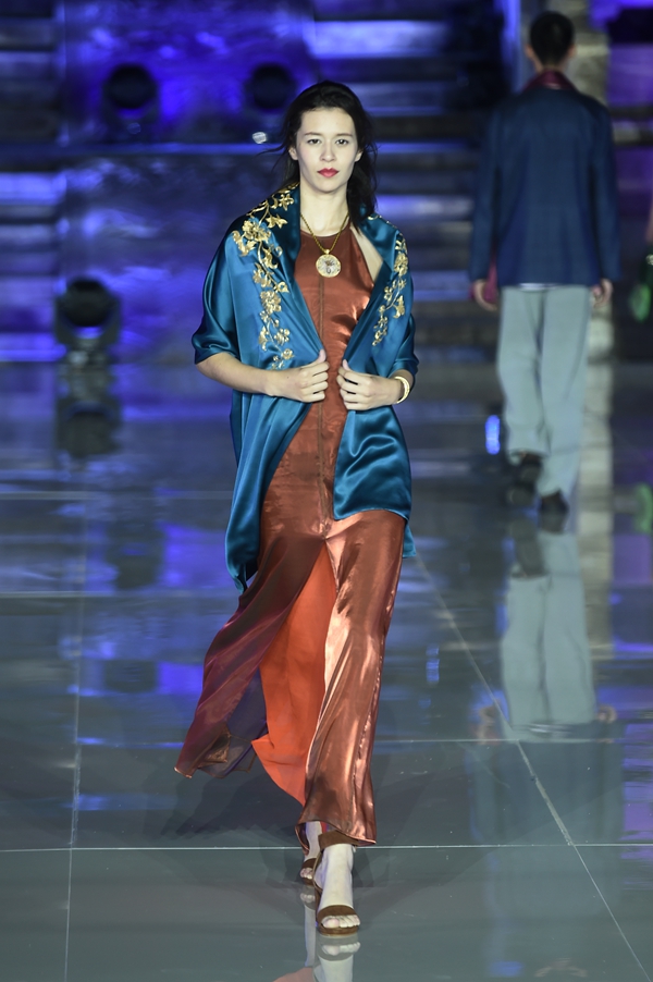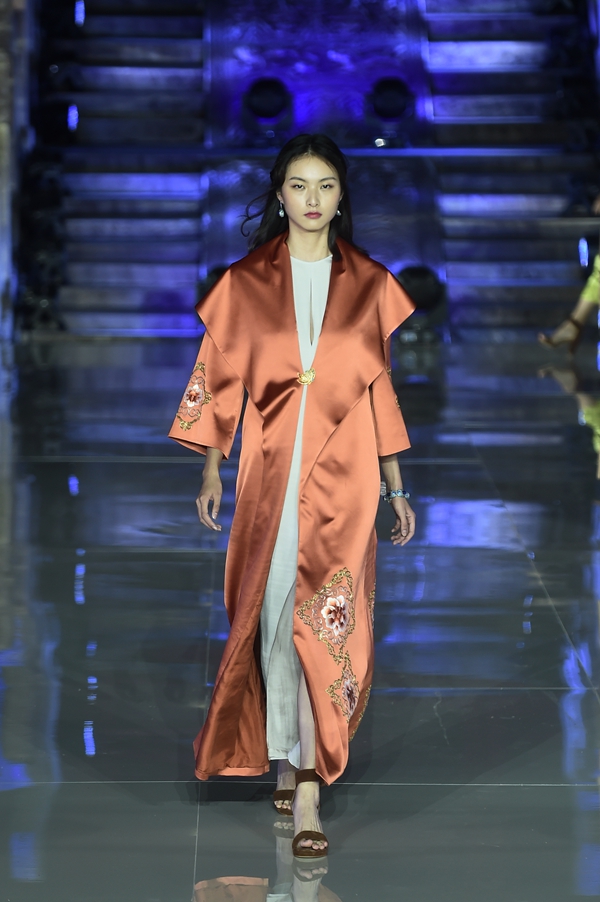 融入京绣元素的服装服饰为此次发布会增添了一抹秀丽之色。京绣作为“燕京八绝”之一,是中华民族传统手工工艺的杰出代表。此次发布的京绣服装产品以时尚简约的概念贯穿始终,廓型为主的整体造型,结合汉代服饰纹样图案,将传统纹饰与现代时尚潮流巧妙的结合,突出时尚气息与民族传统服饰的激情碰撞,给人焕然一新的清新感。特别是此次发布的重工作品,刺绣造型夸张,装饰丰富大气,工艺精湛且图案富有张力,使服装的每个细节都灵动精致,散发着华美的气韵和东方艺术特色。