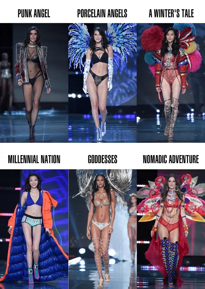 我们先看秀场,今年的维密秀分为六大主题,分别是:Punk Angel(朋克天使)、Porcelain Angels(青瓷佳丽)、A Winter's Tale(冬境传奇)、Millennial Nation(千禧国度)、Goddesses(女神)和Nomadic Adventure(游牧之旅)。