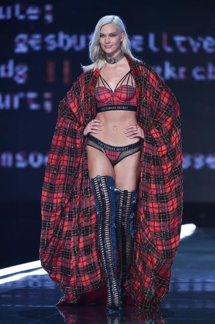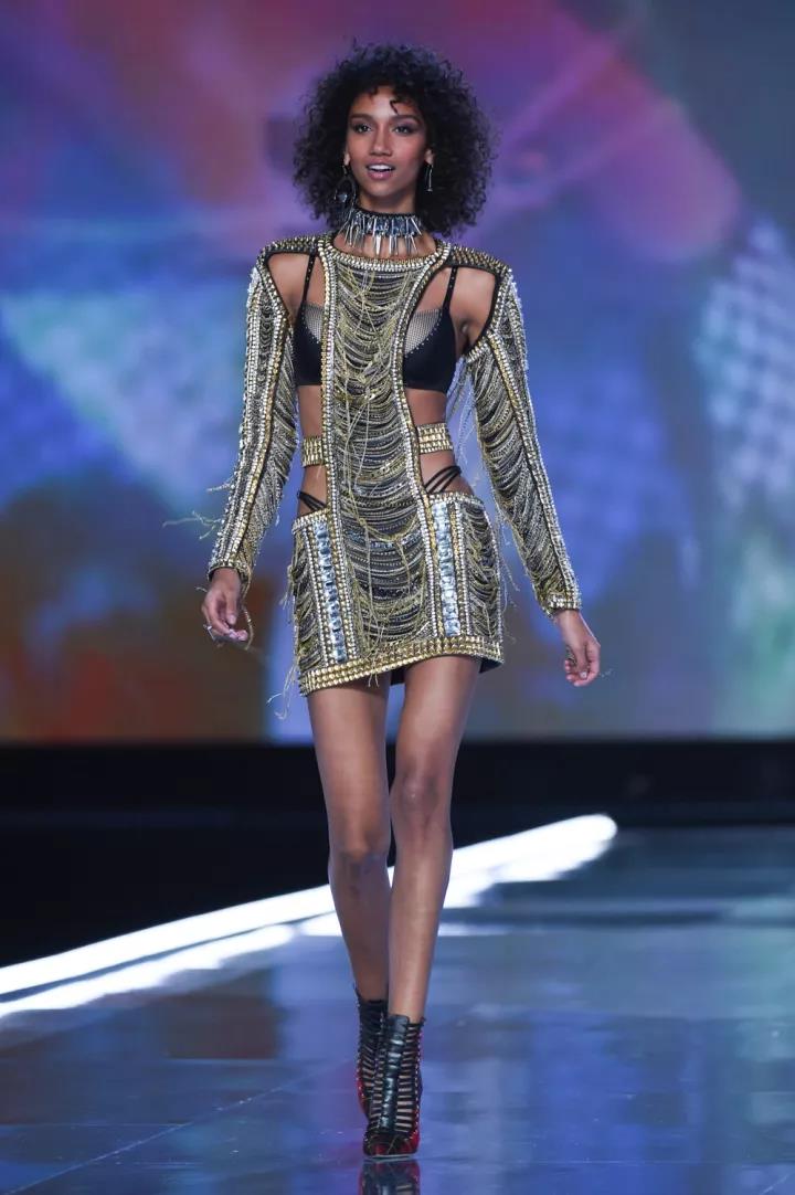Punk Angel(朋克天使)主题,这次和Balmain的合作,也是维密第一次和其他服装品牌进行合作,秀上展示的这些单品只是一部分,秀后这个系列也会进行销售。夸张的配饰、铆钉和别针、破洞牛仔、皮革、格纹这些在今年街头大热的元素出现在维密的T台,性感又强势。