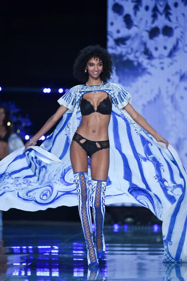 Porcelain Angels(青瓷佳丽)中,最引人注目的就是天使们披着的青花瓷披风,全手绘的青花瓷图案清新优美。维密首次来到中国,这个主题似乎是对中国风的一词更婉约含蓄的表达,比起传统的龙凤、红色、中国结等符号,这样的融合更加现代化。