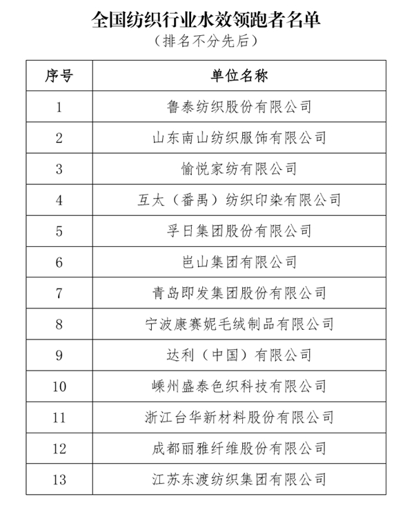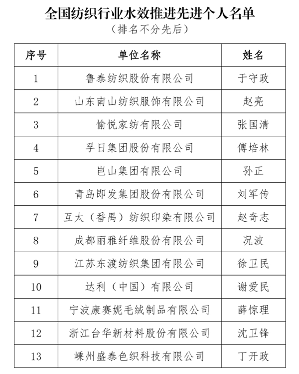 附:纺织行业水效领跑者及先进个人名单