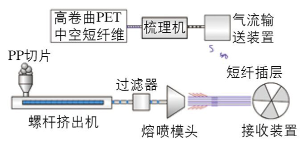 考虑到熔喷纤维细、压缩回弹性差的问题,美国3M公司率先开发了插层熔喷技术,即在传统熔喷生产的过程中,在熔喷纤维流中喷吹入粗旦高卷曲的中空弹性短纤维,在同样的克重下,产品的压缩回弹性大大提高,且结构变得更为蓬松,透气透湿性能也有所提高;此外,粒子在材料中通过的路程曲折变长,从而增加了拦截作用,使得对颗粒的阻隔效果大大提高。