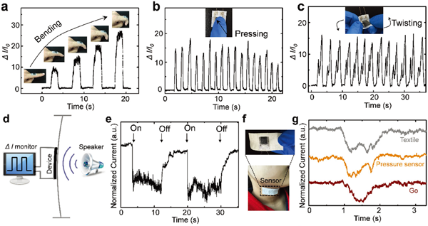 使用纺织传感器实时检测不同的机械力和声音(a共形地安装在弯曲手指皮肤上的可佩戴传感器的电流信号; b、c压缩和弯曲动态机械力下的电流信号;d、e一段音乐的实时声音振动电流信号;f、g附着在颈部的传感器在讲不同单词时的实时电流信号)