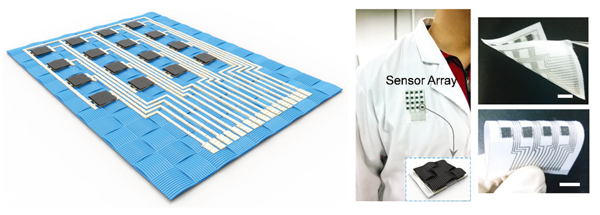 该织物压力传感器可直接穿戴在人体表面,进行微小振动如脉搏的探测。由于该传感器全是由纤维构成,所以也可以直接集成到衣服上,用于实时、动态地描绘压力分布,而不损失衣服原本的舒适和透气性。这样,一部分压力和生理健康信号的探测和响应可以直接由嵌入衣服中的纤维传感器完成,不需要外置的器件。