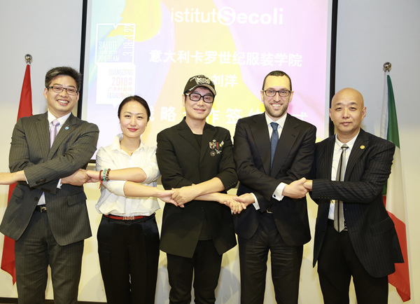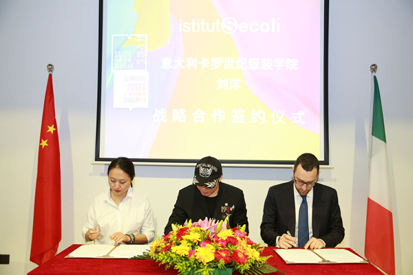 意大利卡罗世纪服装学院与中国服装设计大师刘洋合作,创立“卡罗世纪·刘洋时尚文化奖”签约仪式,3月18日在广州举行。专程从米兰赶来中国的意大利卡罗世纪服装学院院长Matteo Secoli先生、意大利卡罗世纪服装学院广州分院董事长张宇女士,与中国服装设计大师刘洋,在合作推动中国服装设计教育事业的协议上,各自慎重地签下了自己的名字。