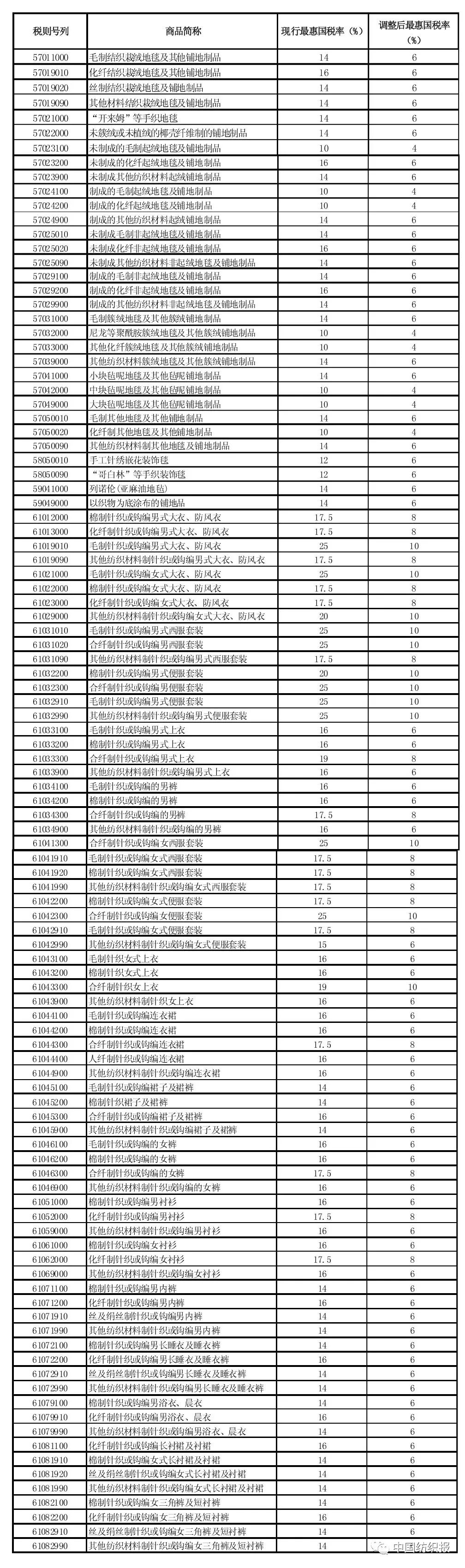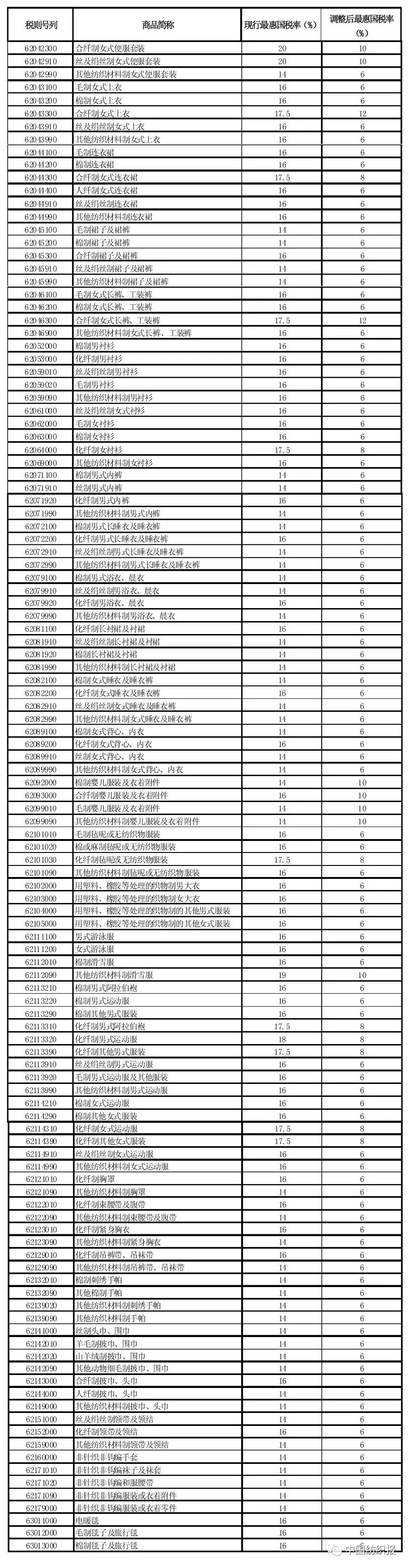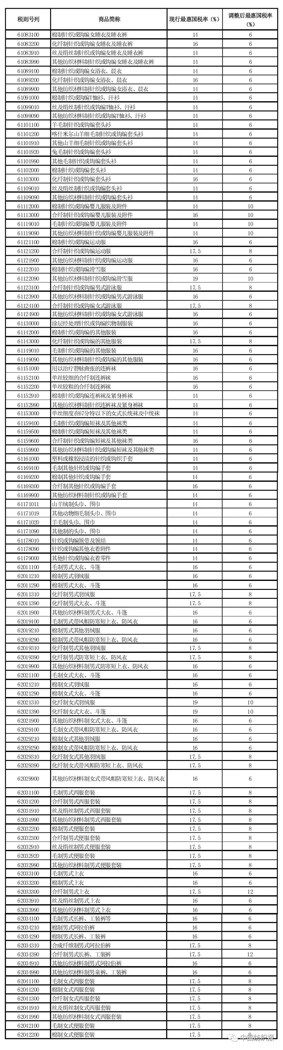 服装相关产品降税清单