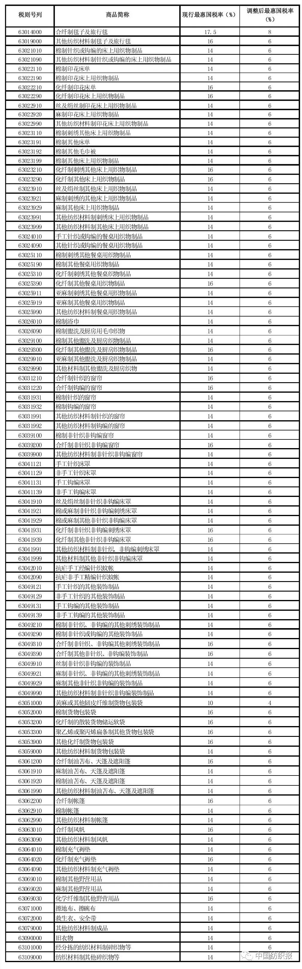 据了解,中纺联此前曾向财政部提交相关建议,从降税结果看,建议在部分产品上得以采纳。