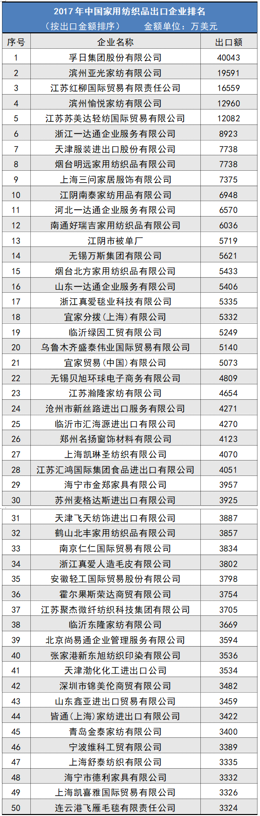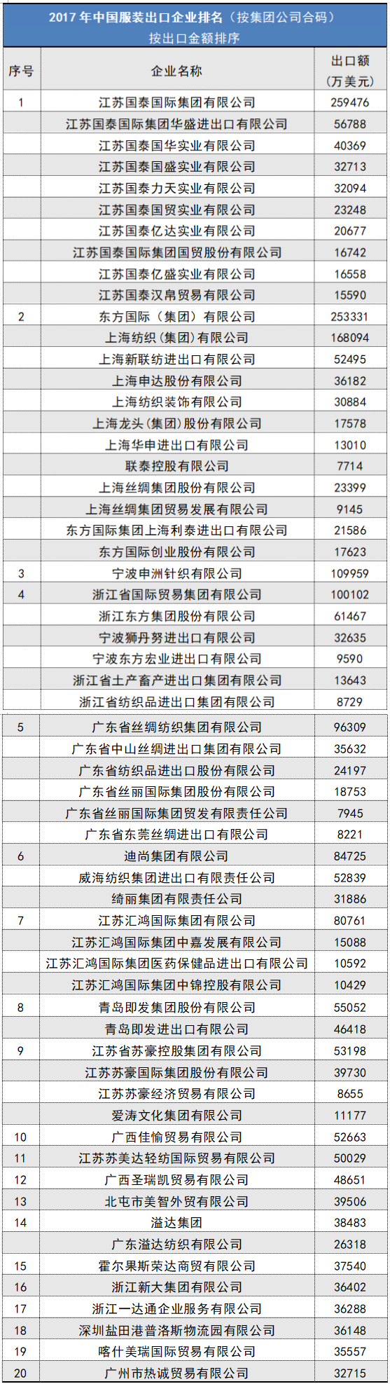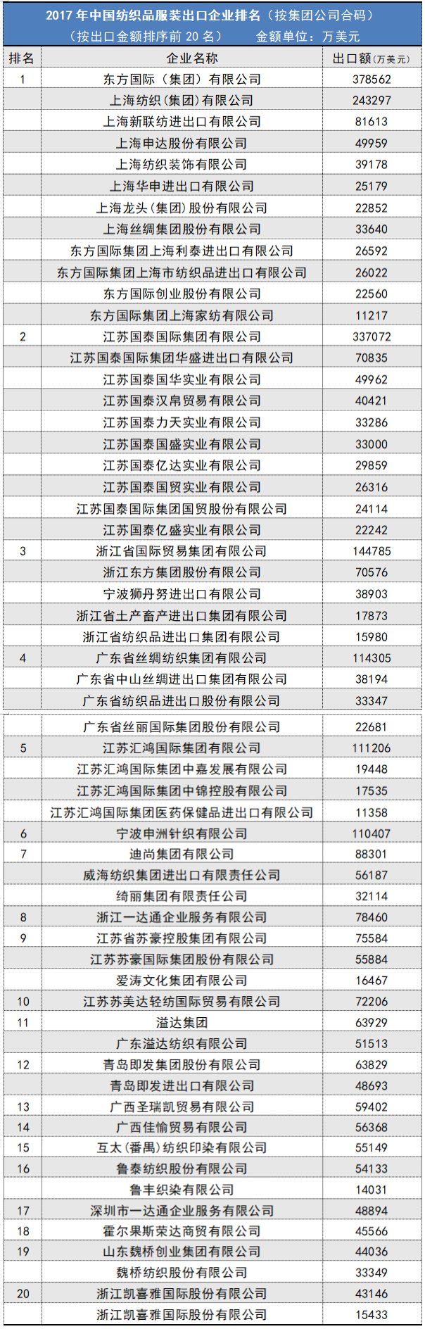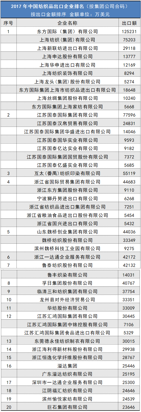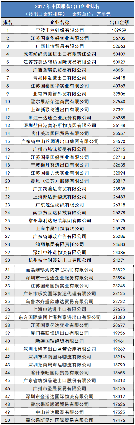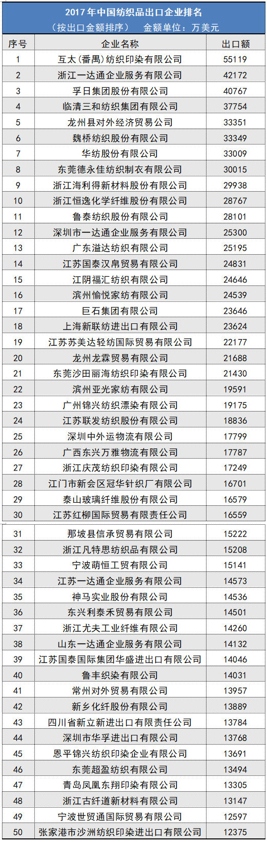 2017中国纺织品服装出口百强都有谁?多个榜单出炉!
