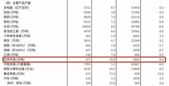在主要产品产量中,化学纤维6月生产总量为471万吨,同比增长12.6%;1~6月生产总量为2461万吨,同比增长8.4%。可以看到在包括钢材、水泥、有色金属、汽车等15种主要产品产量中,化学纤维增量十分可观,6月同比增长幅度仅次于集成电路。