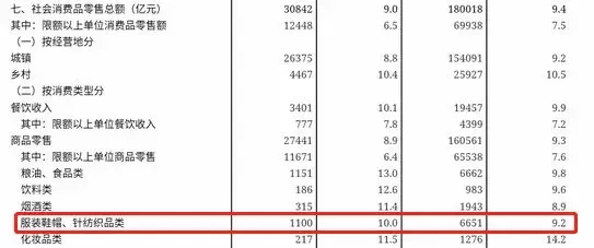 服装鞋帽、针纺织品类6月的零售总额为1100亿元,同比增长10%,1~6月零售总额为6651亿元,同比增长9.2%。
