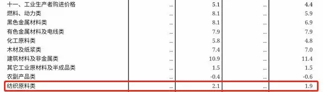 6月,纺织原料类购进价格同比增长2.1%,1~6月同比增长1.9%。增长幅度与有色金属、化工原料、建筑材料等相比相对较低。