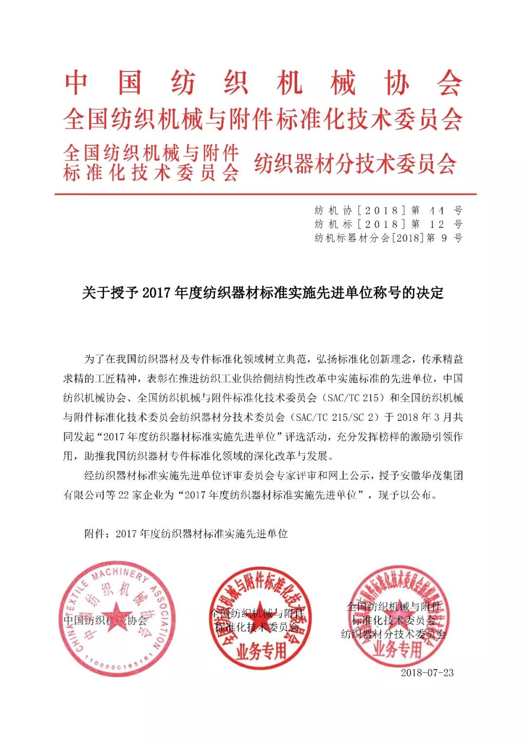 纺机协会联合多部门发布关于授予2017年度纺织器材标准实施先进单位称号的决定