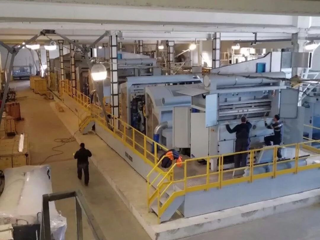 郑纺机派出拥有丰富经验的工程师多次进行实地测量,并最终确定合理的项目布置图。此外,郑纺机通过对设备进行精准称重,参照厂区现状,向客户提供了精确的地基加固方案。因水刺生产过程中需要对大部分水进行循环处理再利用,考虑到俄罗斯客户现有厂房条件不宜对地面破坏开挖水沟,郑纺机施工人员运用反向思维,有针对性地对部分地面加高,形成水渠对水进行收集处理。在产品的设计方面,产品设计主管根据客户现有厂房条件,合理避开厂房支撑柱,在不影响设备整体性能的情况下,对设备进行全新设计。