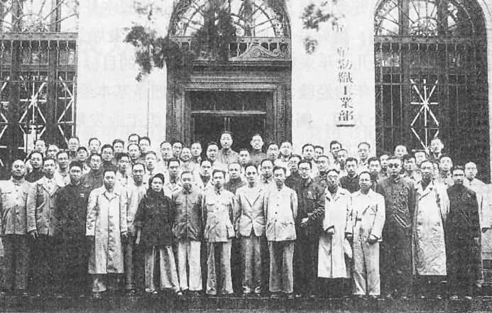 1950年7月,在北京东交民巷纺织工业部办公楼前,钱之光(前排左八)、陈维稷(前排左九)和出席全国纺织机物料会议的代表合影。本报记者 徐国营 供图