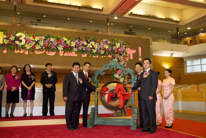 图为浙江义乌华鼎锦纶股份有限公司董事长丁尔民(右一)等共同为华鼎锦纶成功上市鸣锣