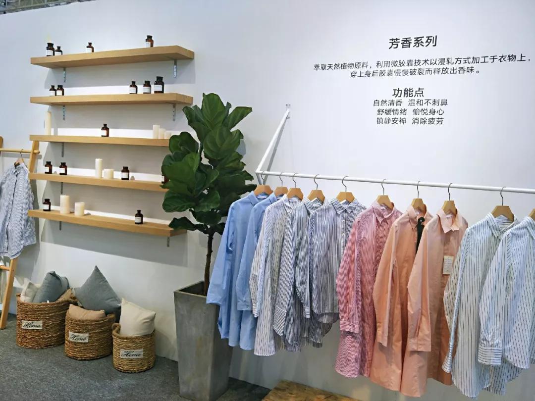 马威展示的芳香系列服装,淡淡的植物香味让人神清气爽。马威面料研发负责人谢亚萍介绍,该系列服装将植物中提取的香氛植物精油,用微胶囊技术锁定并附着在服装纤维上,运动时,附着在纤维上的微胶囊感受到身体产生的热量,就会自动破裂,释放出淡淡的香气,舒缓消费者情绪。