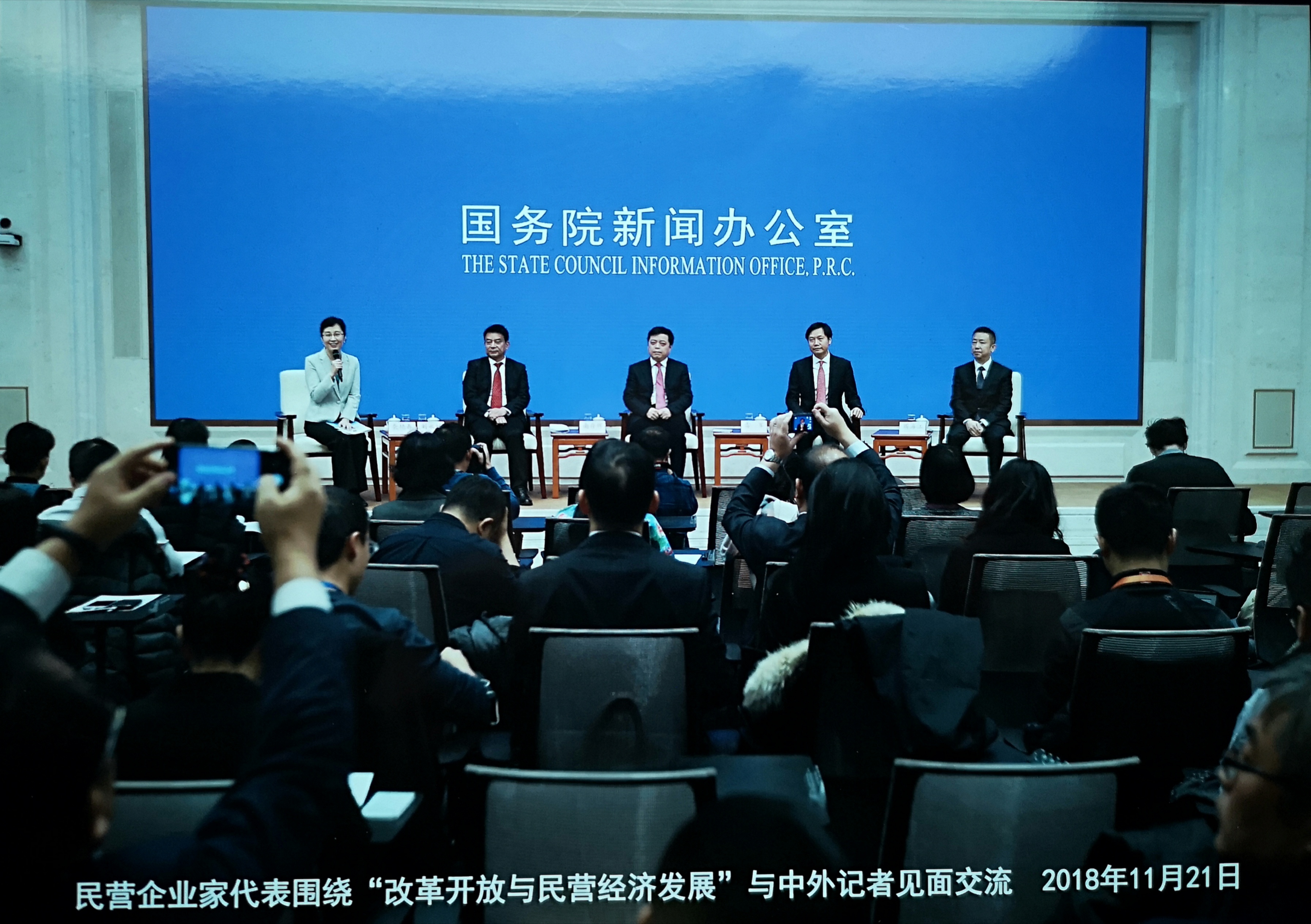 为深入贯彻11月1日民营企业座谈会精神,展示改革开放40年民营企业发展成就,展望未来发展,国务院新闻办公室于11月21日上午举行中外记者见面会,请4位民营企业家代表围绕“改革开放与民营经济发展”与中外记者见面交流。日前刚刚参加了民营企业座谈会的红豆集团有限公司党委书记、董事局主席兼首席执行官周海江,此次又与新希望集团有限公司董事长刘永好、正泰集团股份有限公司董事长南存辉、小米集团董事长兼首席执行官雷军一起受邀参会,与70多家中外记者见面交流。