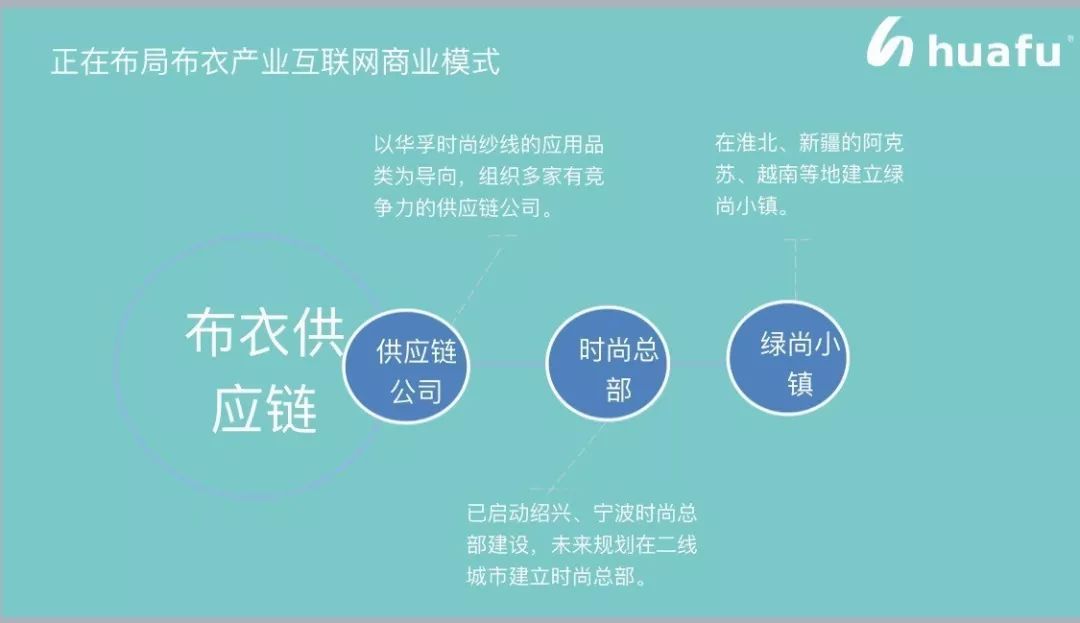供应链公司(以华孚时尚纱线的应用品类为导向,组织多家有竞争力的供应链公司)—时尚总部(已启动绍兴、宁波时尚总部建设,未来规划在二线城市建立时尚总部)—绿尚小镇(在淮北、新疆的阿克苏、越南等地建立绿尚小镇。