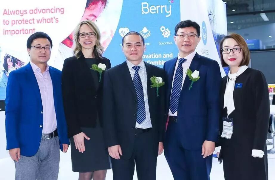 Berry HH&S事业部全球特种材料业务副总裁Wendy Warner博士(左二)、Berry HH&S亚洲区执行副总裁,总经理崔彦昭(左三)、Berry HH&S亚洲区商务及研发副总裁黄祈统(右二)、Berry HH&S市场部经理郭丹艳女士(右一)、荣格工业传媒《国际非织造工业商情》工业资讯总监施建兵(左一)。