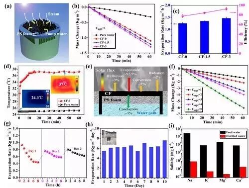 为解决上述问题,中国科学院宁波材料技术与工程研究所科研团队设计并制备了一种具有超稳定环境耐受性的碳纤维材料,用于在光热转化层进行多种介质的纯化。该团队利用水热合成技术在碳纤维表面引入稳定的碳层,以提高碳纤维表面粗糙度,且通过碳化改性过程引入部分极性官能团。改性后的碳纤维的表面极性提高,使得碳纤维能够依靠纤维之间的毛细管作用对液体(水或者有机溶剂)进行自提取,不需要附加额外的汲取材料,简化了太阳能蒸发器件的设计。