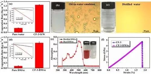 实验结果表明,碳化改性碳纤维的光热转化效率可达到92.5%。碳化改性碳纤维对于水包油乳液(非挥发性硅油)具有良好的去除效果,且可对印染行业中含染料的有机溶剂表现出良好的脱色及纯化效果,染料去除率达99.99%。同时,碳纤维具有丰富的多级纤维结构及良好的毛细汲水能力,对于高盐海水在纤维表面的结晶具有良好的溶解及自修复能力。上述结果表明,碳化改性碳纤维材料,在多介质纯化领域具有广阔的应用前景,大大拓展了目前碳纤维以及光热转化材料在溶剂纯化方面的应用领域。