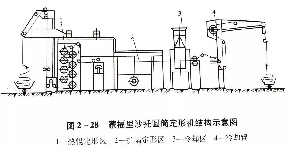 ①圆筒定形。织物经2〜6个圆筒加热(用蒸汽或煤气为热源)处理,然后用冷水辊筒冷却,定形温度可达200℃以上,但织物幅宽不能控制,温度又不易调节,所以采用不多。