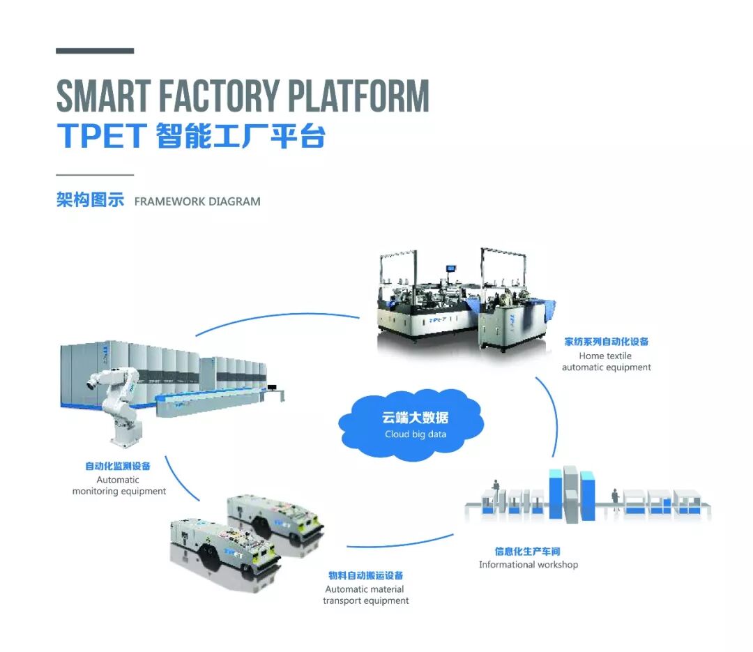 TPET家纺智慧工厂是一套提供生产制造信息化、自动化、智能化的软硬件整体解决方案。通过自动搬运、自动化生产设备、自动化检测设备与信息化软件进行集成,对整个生产过程实现数据采集、过程监控、TPM设备管理、质量管理、生产调度以及数据统计分析,从而实现生产现场的信息化、智能化和柔性化智能制造管理。