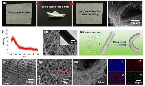 该研究团队设计制备了一种以柔性无机纳米纤维为主体,且在体液中可形状恢复的三维纤维弹性支架。研究团队通过溶胶-凝胶静电纺丝法制备出了像丝绸一样柔韧的SiO2纳米纤维膜,纤维膜可以折叠展开而不破损,纳米纤维可以弯曲180°而不断裂。团队进一步将柔性SiO2纳米纤维复合壳聚糖溶液经过均质分散-冷冻干燥制备出具有超弹性的SiO2纳米纤维-壳聚糖(SiO2NF-CS)三维支架。