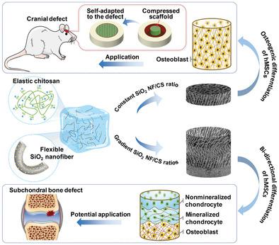 该支架在水环境中80%应变循环压缩下可完全恢复到初始高度和多孔结构,具有快速恢复性,且压缩循环10000次仍结构完好。良好的回弹性使SiO2 NF-CS纤维支架可在压缩状态下植入不同形状的兔下颌骨缺损区域,吸收体液后快速恢复到初始形状,并紧密贴合骨缺损区。同时SiO2 NF-CS支架可提高大鼠颅骨损伤修复效果。研究人员进一步通过控制不同区域SiO2纳米纤维与壳聚糖的比例,构建了从有机到无机、从柔软到坚硬的梯度纤维支架,在软组织与骨界面处的骨缺损修复中展现出巨大的应用潜力。