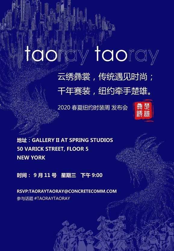 一切传统观念都将被颠覆,一切界限都将被打破,一切“不可能”都将成为现实!人生本无定规,时尚绝不设限,2020春夏纽约时装周,王陶将再次演绎矛盾对立面的镜像拥抱,民族与世界,传统和时尚,楚雄和纽约,彝绣和王陶,TAORAY WANG和taoray taoray,打破常规、不设限的勇气和魅力,敬请期待!