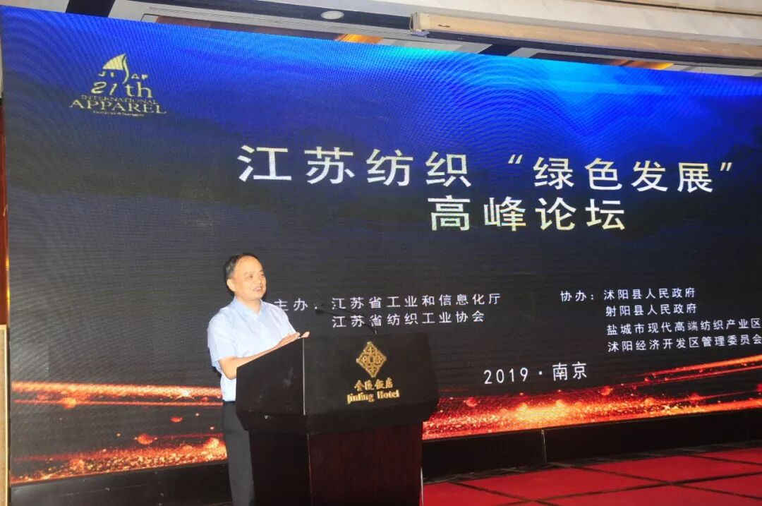 9月5日下午,作为第二十一届江苏国际服装节的重要活动之一,2019江苏纺织“绿色发展”高峰论坛在南京举办。本次论坛由江苏省工业和信息化厅、江苏省纺织工业协会主办,江苏省沭阳县人民政府、射阳县人民政府、盐城市现代高端纺织产业区、沭阳经济开发区管理委员会协办。中国纺织工业联合会副会长夏令敏,江苏省工业和信息化厅消费品处处长俞兵华,江苏省纺织工业协会名誉会长谢明,江苏省射阳县政协主席邱德兵,江苏省沭阳县委副书记、县长彭伟,江苏省生态环境评估中心副主任王静等领导嘉宾出席论坛。论坛由江苏省纺织工业会长韩平主持。韩平指出,纺织工业在当前积极推进生态文明建设,以前所未有的力度推进环境保护工作。在执法力度越来越大的形势下,纺织印染企业应当把环境保护当做企业的生命线。大家一定要解放思想,改变观念,找准发展方向和路径,创新发展模式或发展观念,推进企业的可持续发展,提高企业的绿色发展竞争力。韩平强调,节约资源和保护环境是我国的基本国策,作为太湖流域、长江流域、江苏水网地区的产业,江苏纺织有责任将绿色发展作为最重要的责任。