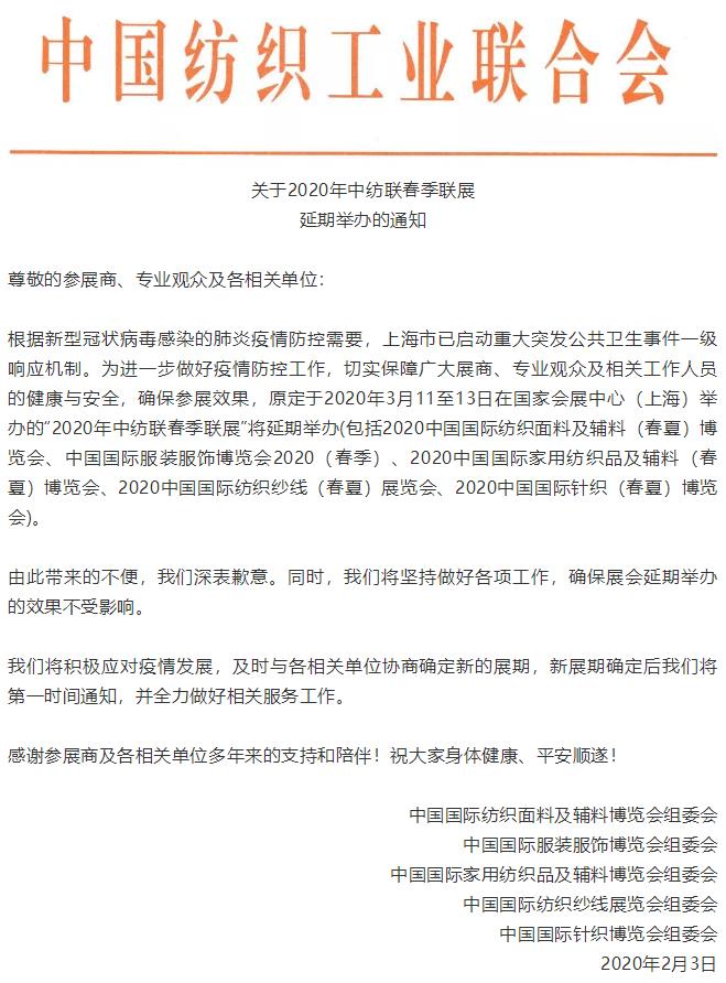 通知:2020年中纺联春季联展延期举办