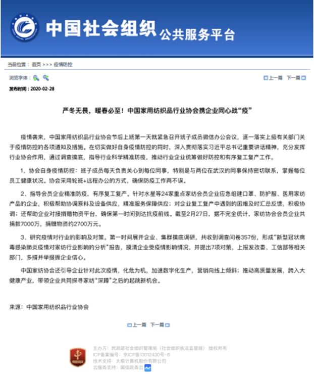 近日,由“中华人民共和国民政部社会组织管理局”主办的“中国社会组织公共服务平台”发布了“严冬无畏,暖春必至!中国家用纺织品行业协会携企业同心战‘疫’”一文。充分体现其对中国家用纺织品行业协会针对疫情期间的一系列工作部署予以肯定。