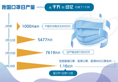 数据显示,2月初,我国口罩产能约为每天2000万只,日产量1000万余只;2月22日,口罩日产量达5477万只;2月25日,全国口罩日产能达到7285万只,日产量达到7619万只。2月29日,包括普通口罩、医用口罩、医用N95口罩在内,全国口罩日产能达到1.1亿只,日产量达到1.16亿只。