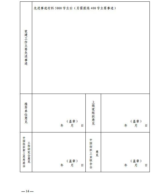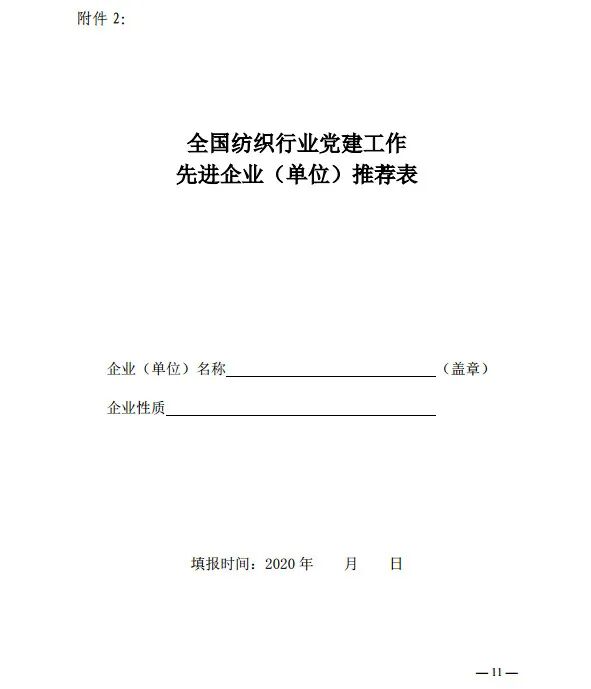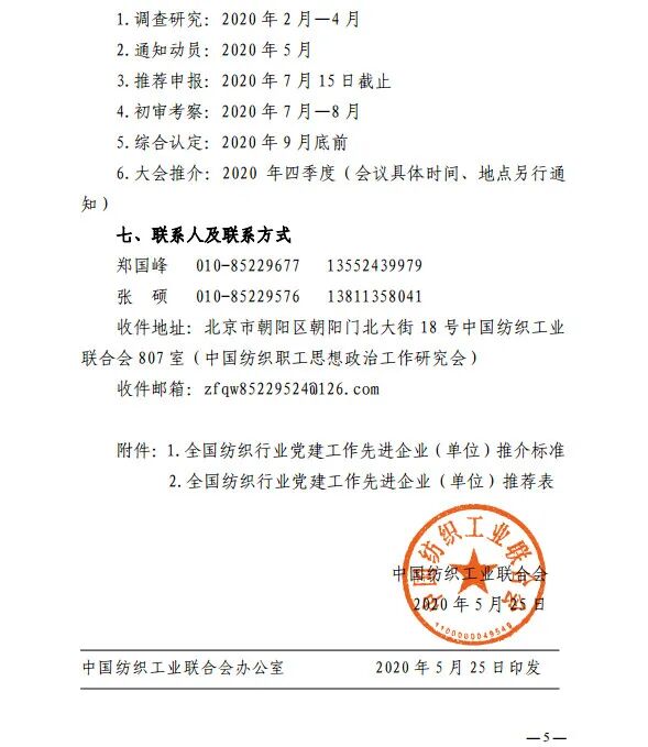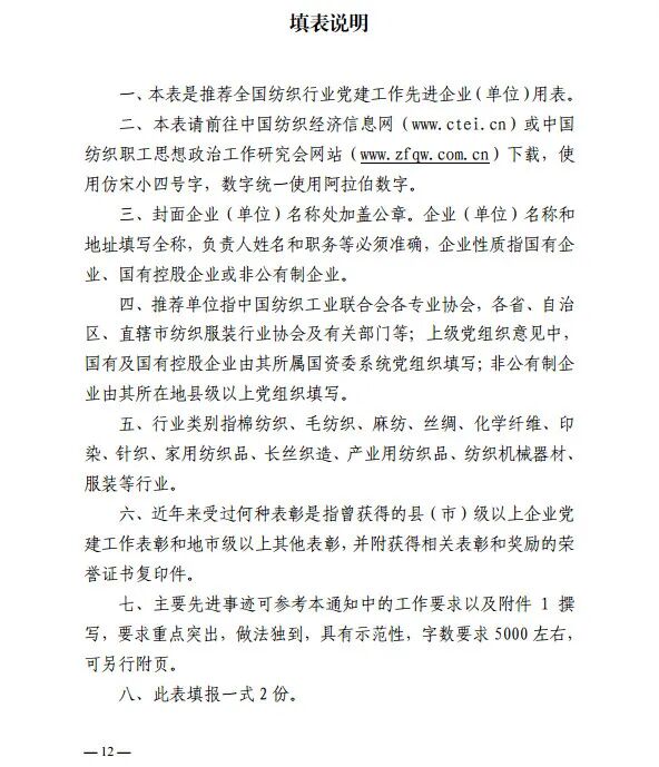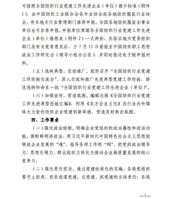 《通知》指出,此项工作由中国纺织工业联合会主办,中国纺织职工思想政治工作研究会承办,成立纺织全国纺织行业推进党建工作标准化工作领导小组办公室,承担日常工作。全国纺织行业党建工作先进典型由中国纺织工业联合会各专业协会或各地纺织服装行业协会、有关地方行业管理部门推荐申报,全国各地纺织服装企事业单位也可自荐申报。申报截止日期为2020年7月15日。
