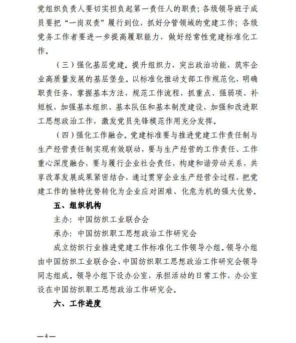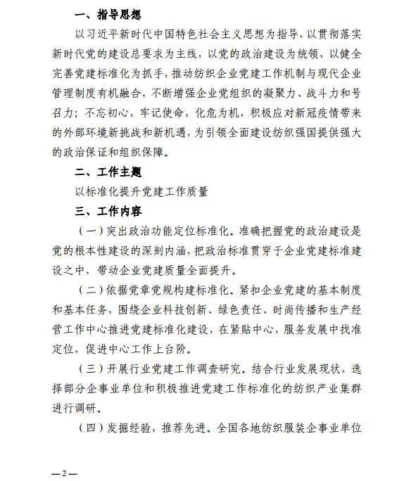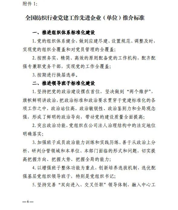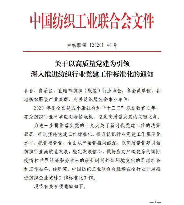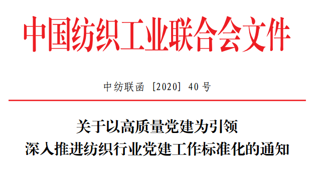 按照《中国纺织工业联合会党委2020年党建工作要点》工作安排,近日,中国纺织工业联合会正式下发了《关于以高质量党建为引领,深入推进纺织行业党建工作标准化的通知》。