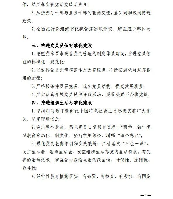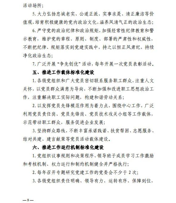 《通知》明确了此项工作以实现工作内容具体化、组织设置合理化、组织生活经常化、组织程序流程化为目标,并特起草制订了《全国纺织行业党建工作先进企业(单位)推介标准》,该标准包含组织体系标准化建设、领导班子标准化建设、党员队伍标准化建设、组织生活标准化建设等八方面内容。