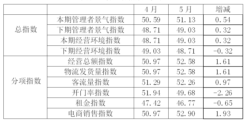 从商户景气指数来看,总指数中,5月商户景气指数为50.13,比4月的48.92上升1.21个百分点;经营环境指数为48.83,比4月的47.55上升1.28个百分点。