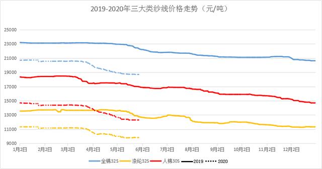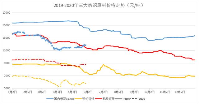 上图是2019年以来的三大原料价格走势图。其实从2019年开始纺织原料就处于下行区间当中。三大原料当中棉花算是较为坚挺的一个,2019年5月开始下跌,年底受中美贸易利好影响,出现一波反弹行情。棉花从年初15369元/吨下跌至13369元/吨共下跌13%,进入2020年截至到5月底,棉花价格从年初的13601元/吨下跌至11807元/吨,同样是13个点,5个月的时间就赶上了去年一年的跌幅。