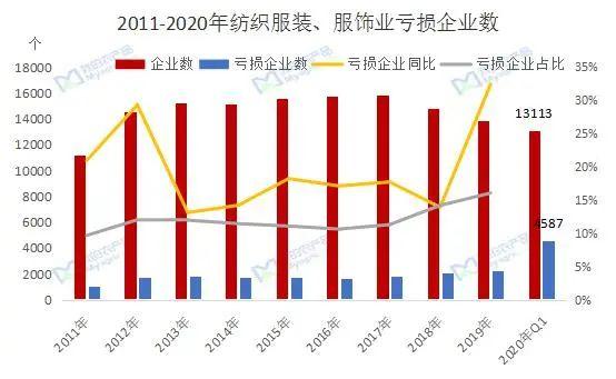 据国家统计局数据显示:截止2019年末,我国纺织服装、服饰业企业数量为13876家,其中亏损企业数为2225家。2020年,在疫情的影响下,服装行业面临前所未有的挑战,亏损企业数量大幅增长。数据显示:截止2020年一季度全国纺织服装、服饰业企业数量为13113家。其中,亏损企业数量4587家,上年同期为2948,同比增长55.6%。由于疫情的全球爆发,疫情对纺织服装厂产生了巨大的影响,直接导致终端消费快速下滑,库存累积严重;纺织服装的订单量是越来越小,疫情期间,国外纺织处于停顿状态,订单大部分取消或延期交付,亏损企业数量大幅增加。