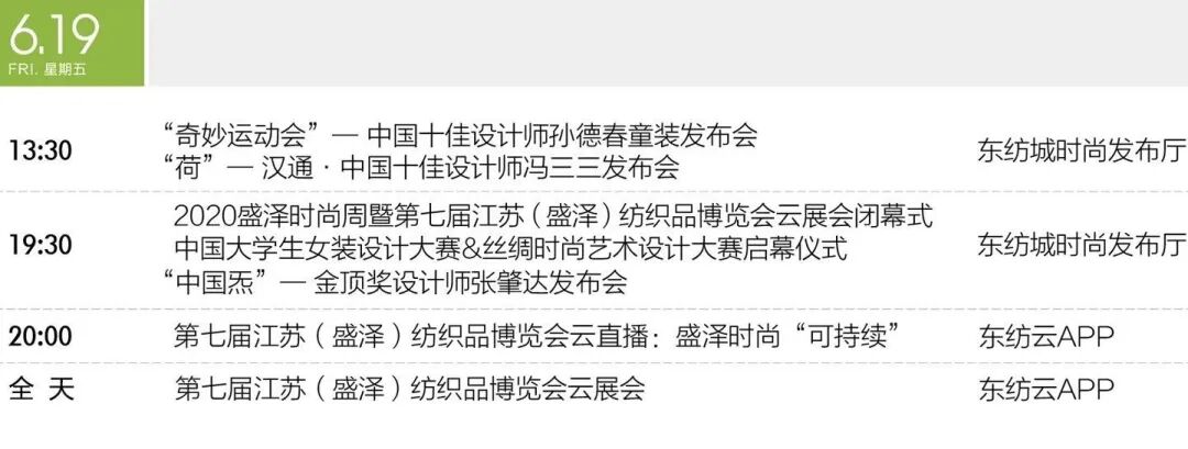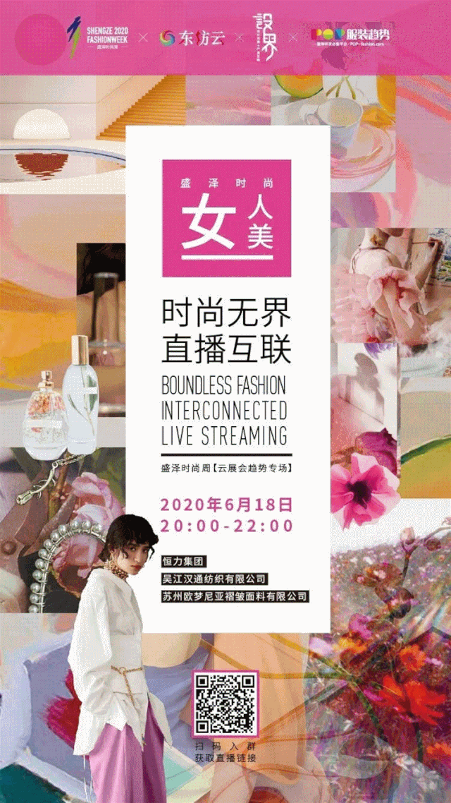 本届时尚周汇聚了业内多名顶尖设计师,如双“金顶奖”设计师张肇达,“金顶奖”设计师潘怡良、陈闻,以及设计师熊英、冯三三、胡馨予、孙德春等。他们将时尚设计与盛泽原产原创面料“联姻”,通过多场时尚秀演全方位展示盛泽尊重创意、弘扬创新的城市精神和包容、开放、阳光、活力的城市气质。2020盛泽时尚周期间举办云展会,200多家盛泽优质纺织企业在线上齐聚,依托“话东方”“现未来”“女人美”“可持续”四大主题线上展区,展示数万款融合了“科技、绿色、时尚、流行”元素的面料产品。其中,“话东方”关注纺织面料成衣品牌,“现未来”聚焦功能科技面料,“女人美”关注女装时尚面料,“可持续”则聚焦再生环保面料。云展会突破了原有展位面积的限制,让当季最新产品实时上线,采购商可以突破时间与空间的限制,实现24小时线上“云观展”,与展商在线“零距离”交流。对于意向面料,采购商可以通过每日专场直播入口了解详情,还可线上一键采购,方便快捷。“时尚无界、直播互联”主题云直播也是本届时尚周的一大亮点。在四天时间里,恒力、盛虹、鼎盛、华佳、盛得忆等12家盛泽纺织企业围绕“话东方”“现未来”“女人美”“可持续”四大主题直播展示各自“科技、创新、绿色、时尚”的拳头产品,从不同领域和角度出发,向全球时尚产业展示“盛泽时尚”高质量创新创意发展的成果。